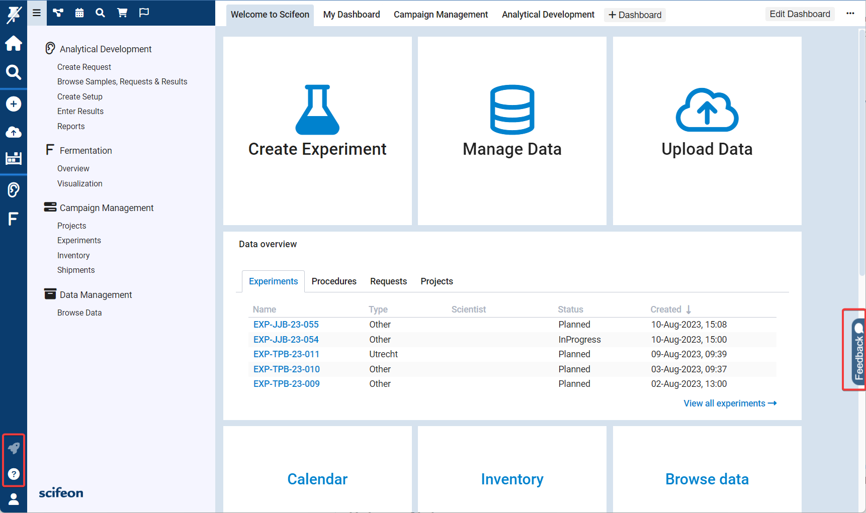 In the navigation bar on the left there is a Help and Support item (question mark icon - see in the screenshot above). Click this to find links to the Scifeon support site (i.e. these pages). Further on the right, there is a Feedback button (see screenshot above). Click this to give feedback on the platform, including reporting errors or asking questions.