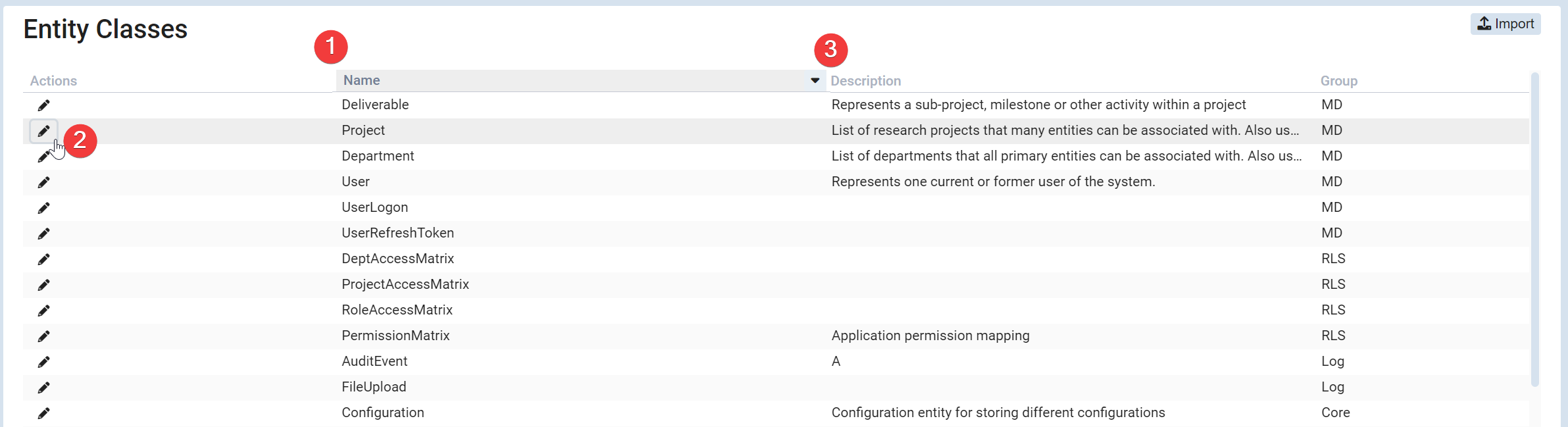 Now we are on the Entity Class overview. Here you can see a list of all entities in your system. The list shows each entity name (1), a button where you can edit the entity (2).