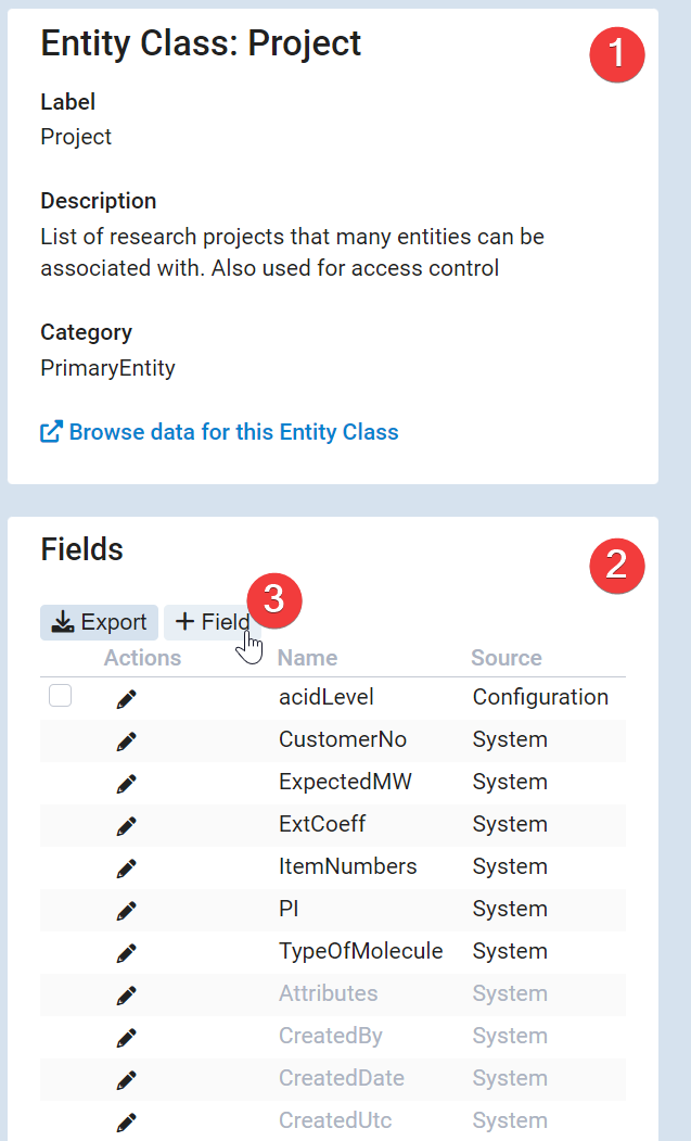 After you have found the entity you wish to add fields to and clicked the pencil button, the selected entity will appear in the right side (1) together with a list of all fields currently existing on the entity (2). To add a new field click the + Field button (3).