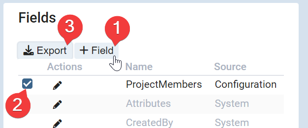 Create one or more new fields on an entity (1). Select all the fields needed from the list (2), and click export(3).