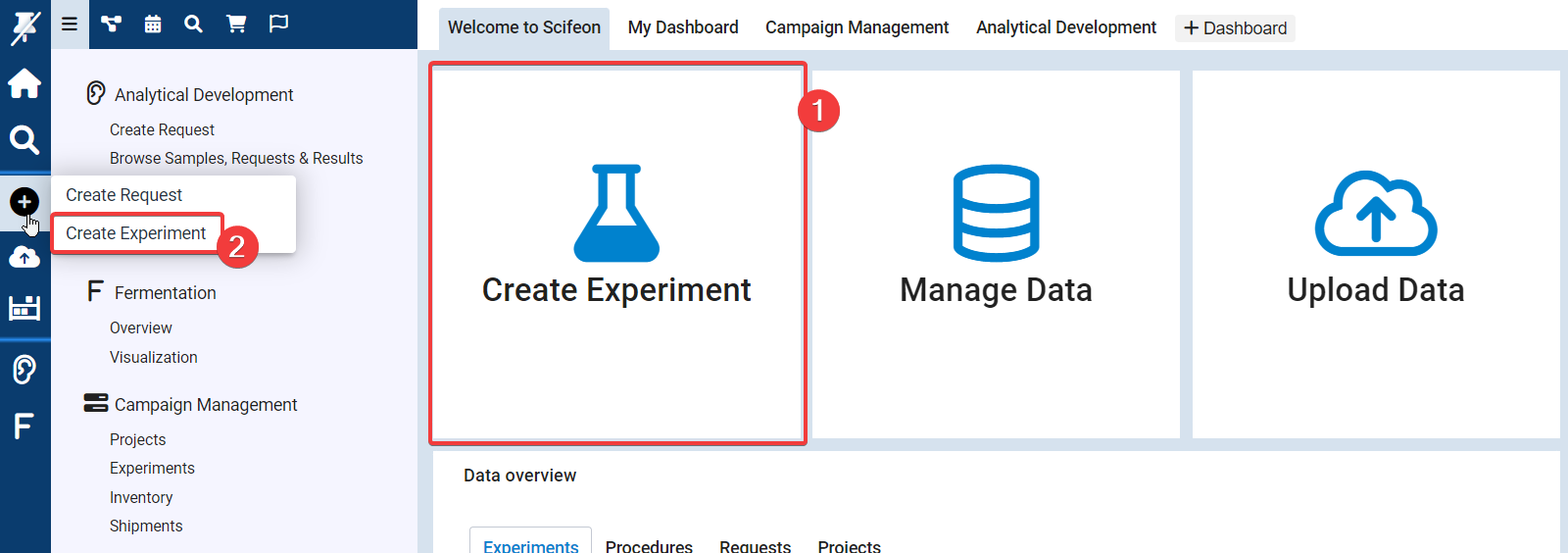 To create your first experiment in the ELN, click Create Experiment on the Welcome to Scifeon dashboard (1), or click Create Experiment from the quick-create menu (2) in the navigation side-bar.