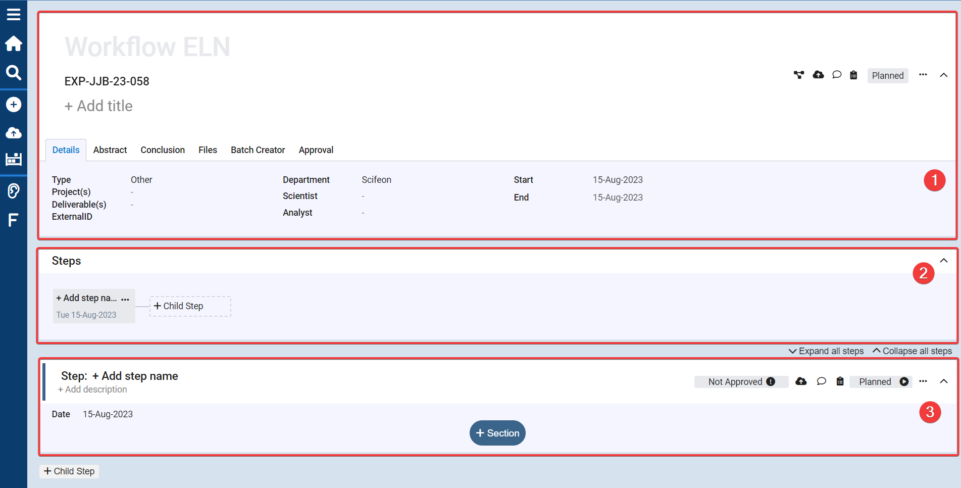 - Experiment header section – with the Name and Title of the experiment and other meta-data.