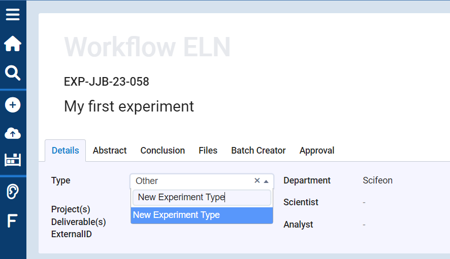 Thus, the other fields can be changed, like Project, Department, etc. The Scientist (the person responsible for the experiment) can also be changed for the experiment, and the Analyst (the person executing the experiment, and who by default is the same as the Scientist) can be set for the entire experiment (multiple Analysts can be added on the different steps, see below).