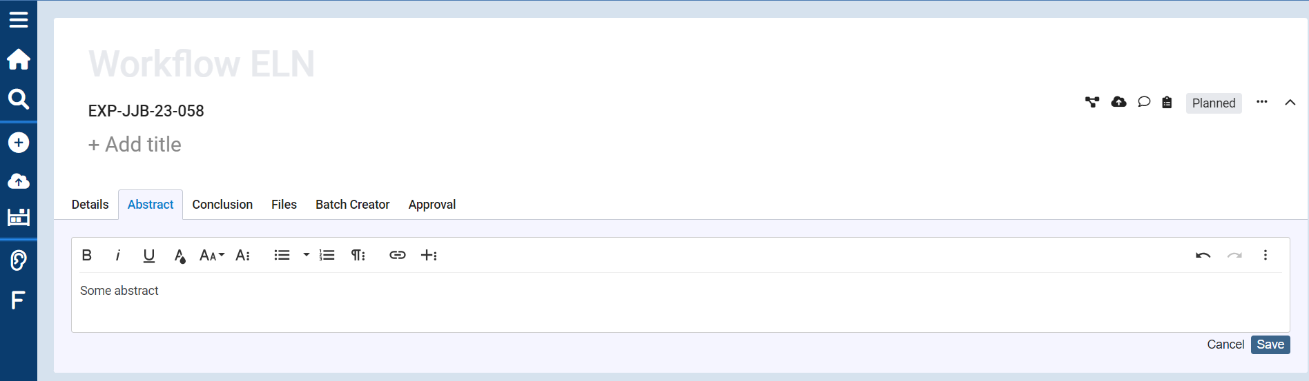 An abstract can be added to the experiment by selecting the Abstract tab, and double-click the + Add Abstract placeholder (or clicking the pencil icon) which will activate the Rich Text Editor. A conclusion can be added in the exact same way by selecting the Conclusion tab.