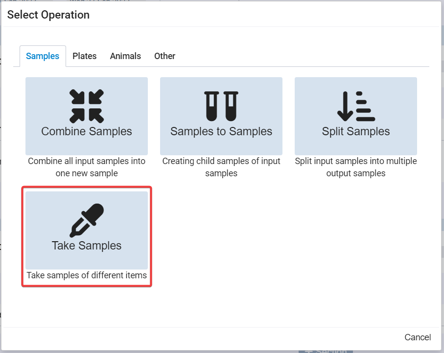 The Take Samples operation can be used to e.g. take a sample from an animal, or take a child sample from a parent sample. The operation is available in the ELN, and can be used to register samples in Scifeon.