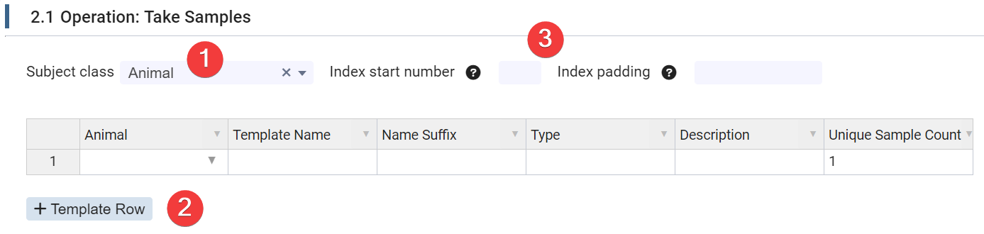 First the Subject of the sample must be selected. This can be done by clicking the Subject class dropdown (1). The grid includes templates for generating samples, + Template Row (2) are used to add new templates.