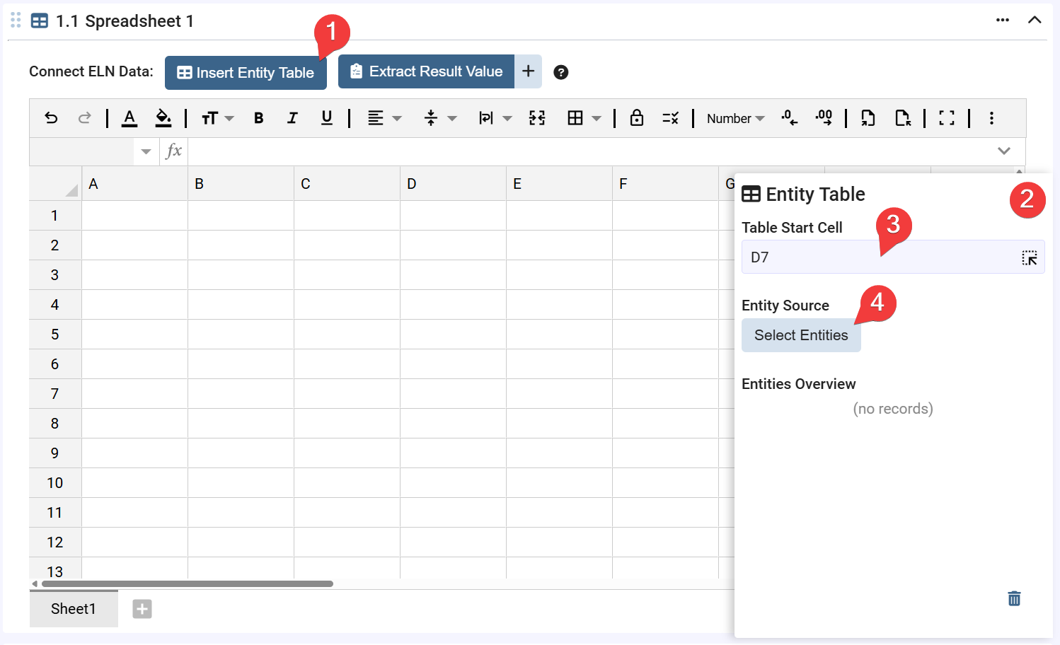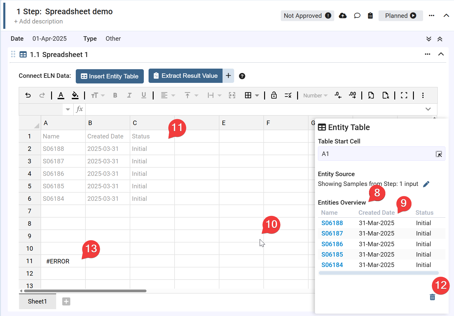 It is possible to insert any data from the ELN into a Spreadsheet: