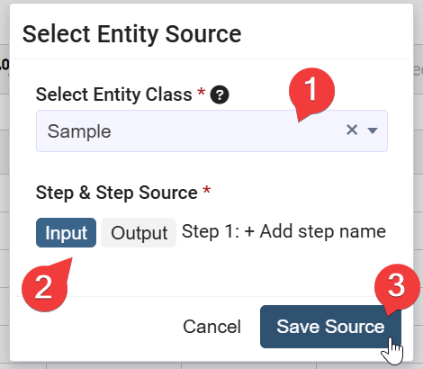 - Select Entity type - Select desired type e.g Samples, Batches, Animals or Fermentations