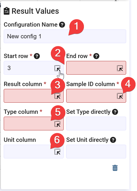 - Unit column (optional) - The column where the Result Values unit is. (Direct input available)