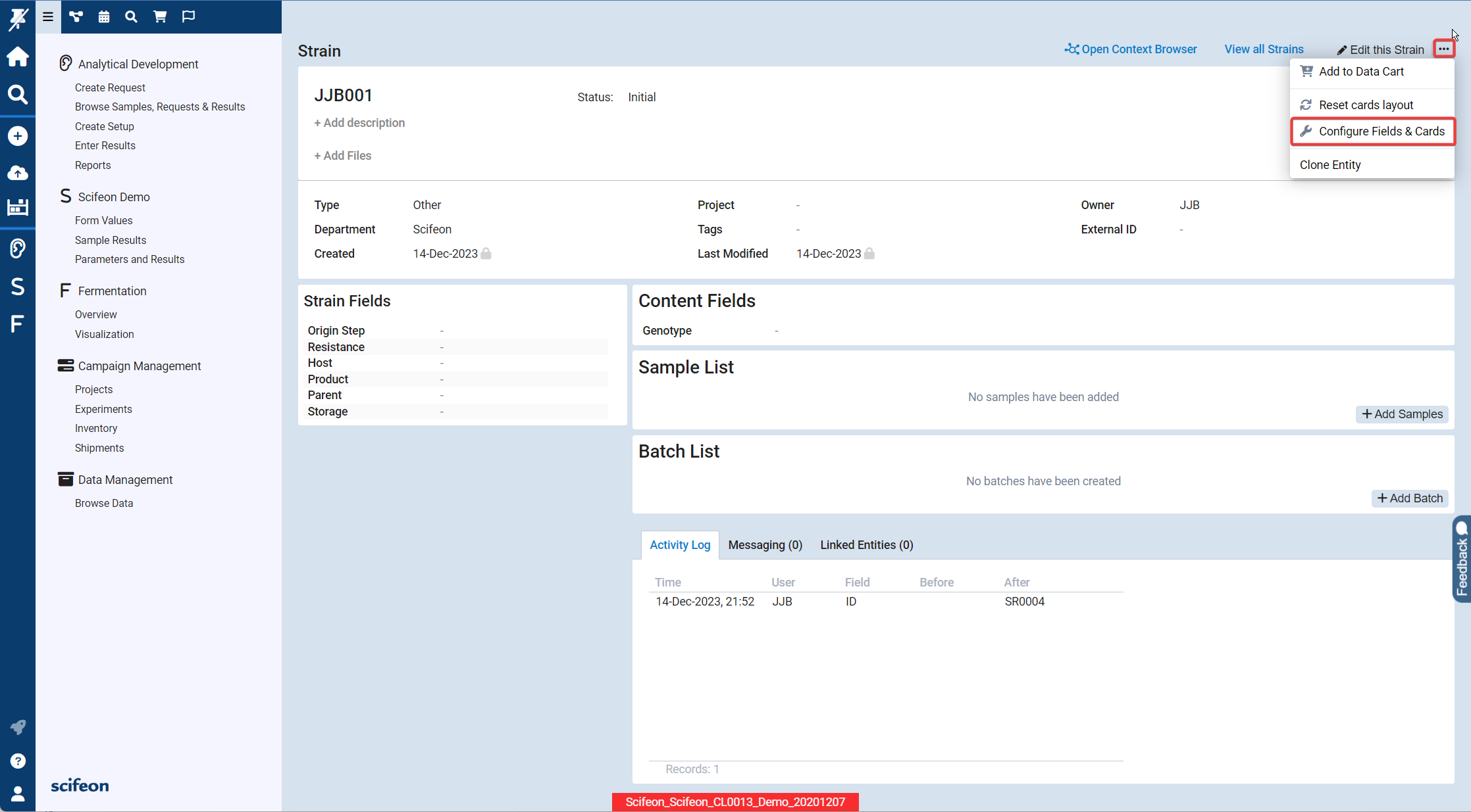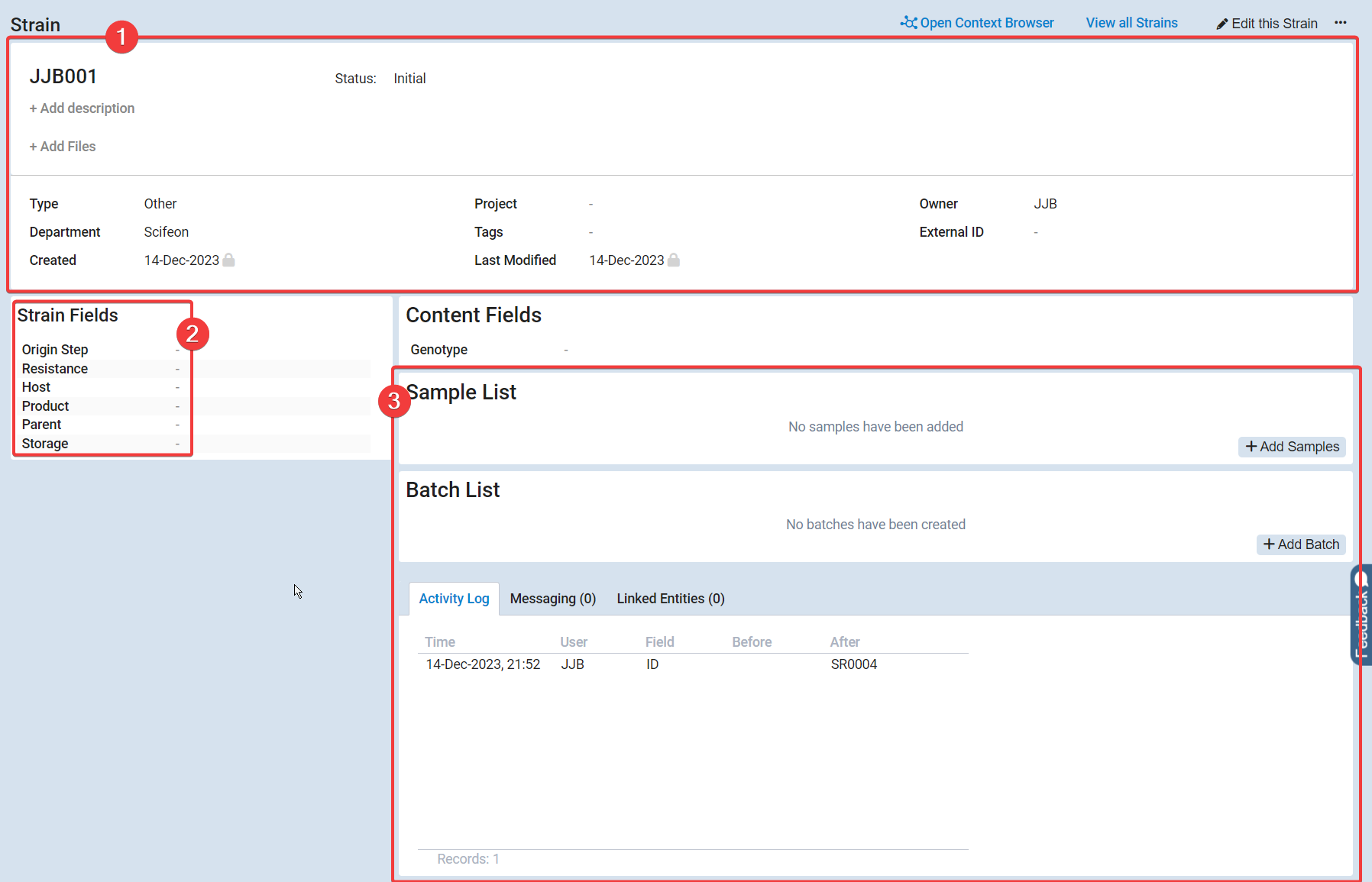 - Content - This varies greatly from entity to entity, but for Samples it could be related results, for Procedures the related experiments, etc.