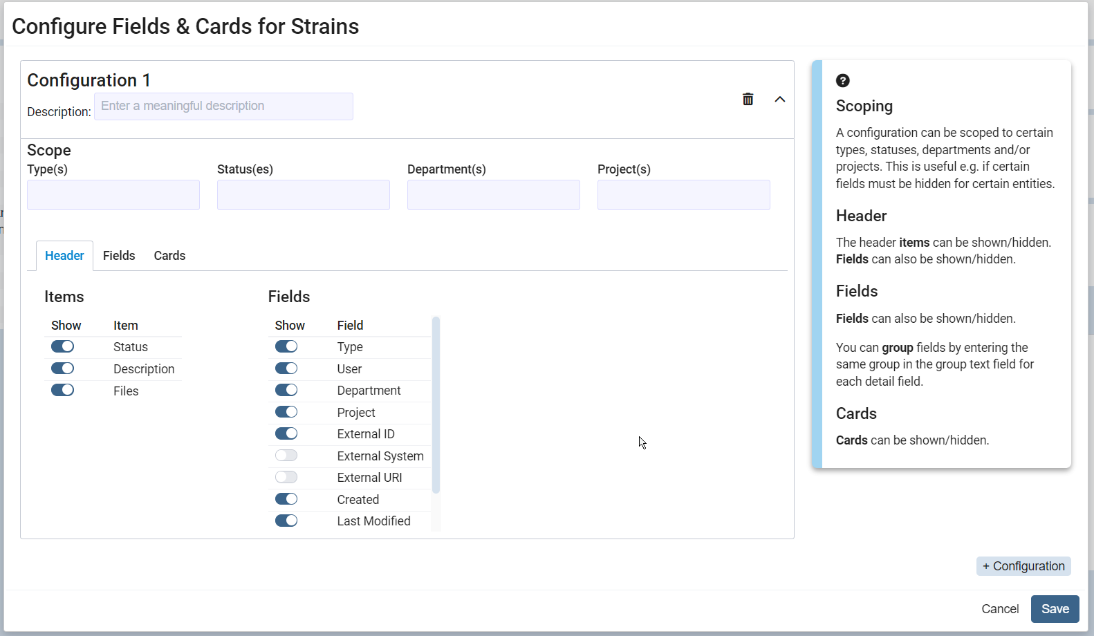 Here you can edit existing configurations or create new ones. A configuration is matched against the entity type and the entity instance, and the first matching configuration is used. If no configuration is found, the default configuration is used.