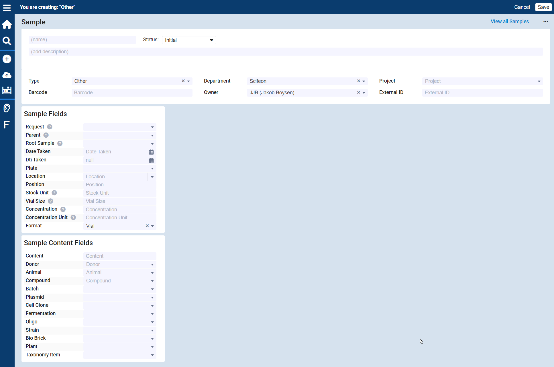 This is the simplest way of creating data, but it is also possible to create data from other places in the system, such as from an experiment, etc. The create view is the same as the EDP view, but with all fields editable. Add the desired information and click Save in the upper-right corner.