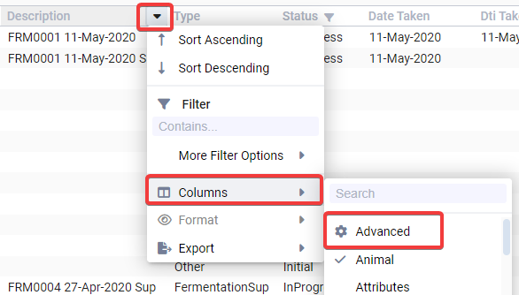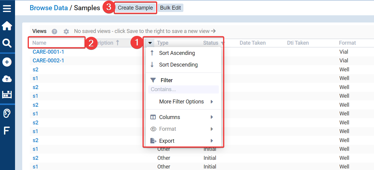 Here you can see the list of samples in the system. Click the arrow (1) on the column headers that become visible when hovering to see the options for each column: