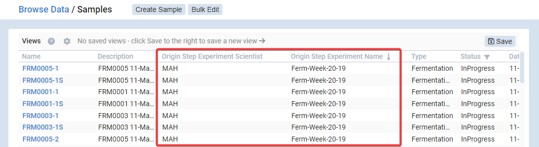 This is done by selecting the entity you want to join from the drop-down menu, and then selecting the property you want to join on. For instance, in a Sample-list, you can now view the name and scientist of the Experiment from which the Sample originates: