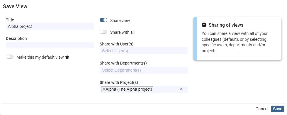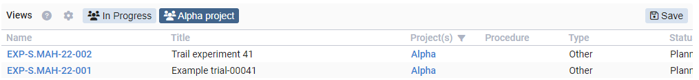 The Views-bar comprises essential elements, including a Help and Configure icon, your saved views, and a Save button. When filters, sorting options, or visible columns are applied, you can conveniently save the newly configured view using the Save button. Moreover, these views can be easily shared with your colleagues, allowing for seamless collaboration and knowledge exchange. Share views collectively, individually, by project, or even by department, ensuring effective communication within your research team.