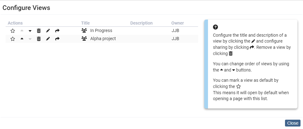 Additionally, the configuration enable you to customize the order of the views according to your preferences. You even have the flexibility to set a specific view as your default, which will automatically appear when loading the list page in the future. This personalized experience streamlines your workflow and saves you valuable time when accessing relevant information.