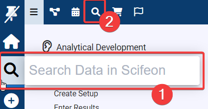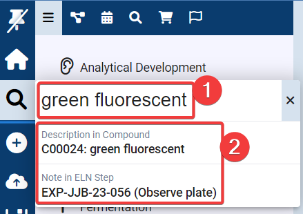 These search field (1) are searching across all entities in the system, and the search results (2) are shown close to the search field (1). Data searched are names, descriptions, titles, notes in experiments, messages, barcodes, etc.