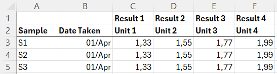 Typecan be set to read from row 1, andUnitfrom row 2. When processing the cell atC3, the system will look atC1for theTypeandC2for theUnit.