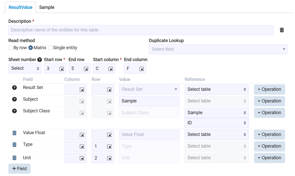 - Reference Other Entities: Link fields to data from previously defined entity tables (e.g., setting a subject ID for result values by referencing a sample record).