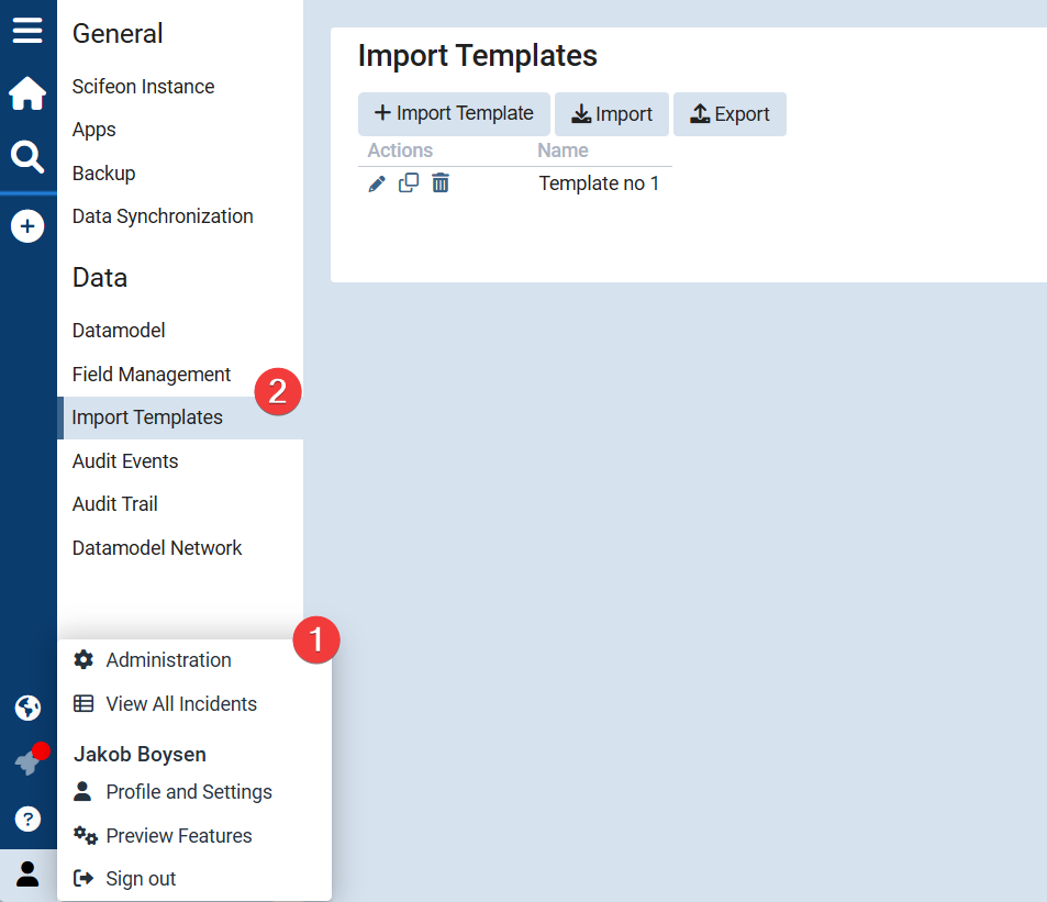 You find the Import Templates (2) in the Administration (1) section of Scifeon. You need to be Administrator or Data Manager to access this feature. The Import Templates defined will always be checked against the file you are trying to upload e.g. on the Upload Page or in the ELN. If a match is found, the import will be performed using the selected Import Template. If no match is found, other Data Loaders might match the uploaded file.