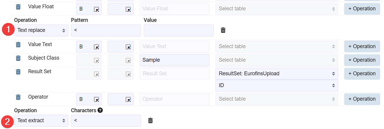 In the following case, the cells includes < in some cases when the value cannot exactly be measured. The operator Text replace (1) is used to remove the < and only keep the numeric value. For the Operator field the Text extract (2) is used to extract the text < if it is there. Everything else is removed.