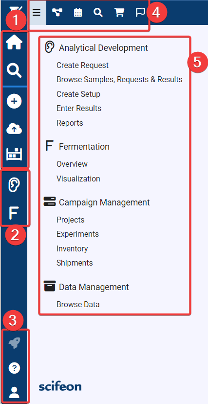 When you have signed in, you see the navigation bar on the left (pictured in the image below). The items in (4) and (5) can be hidden by clicking the crossed over needle icon. The different boxes marked in the image are described below.