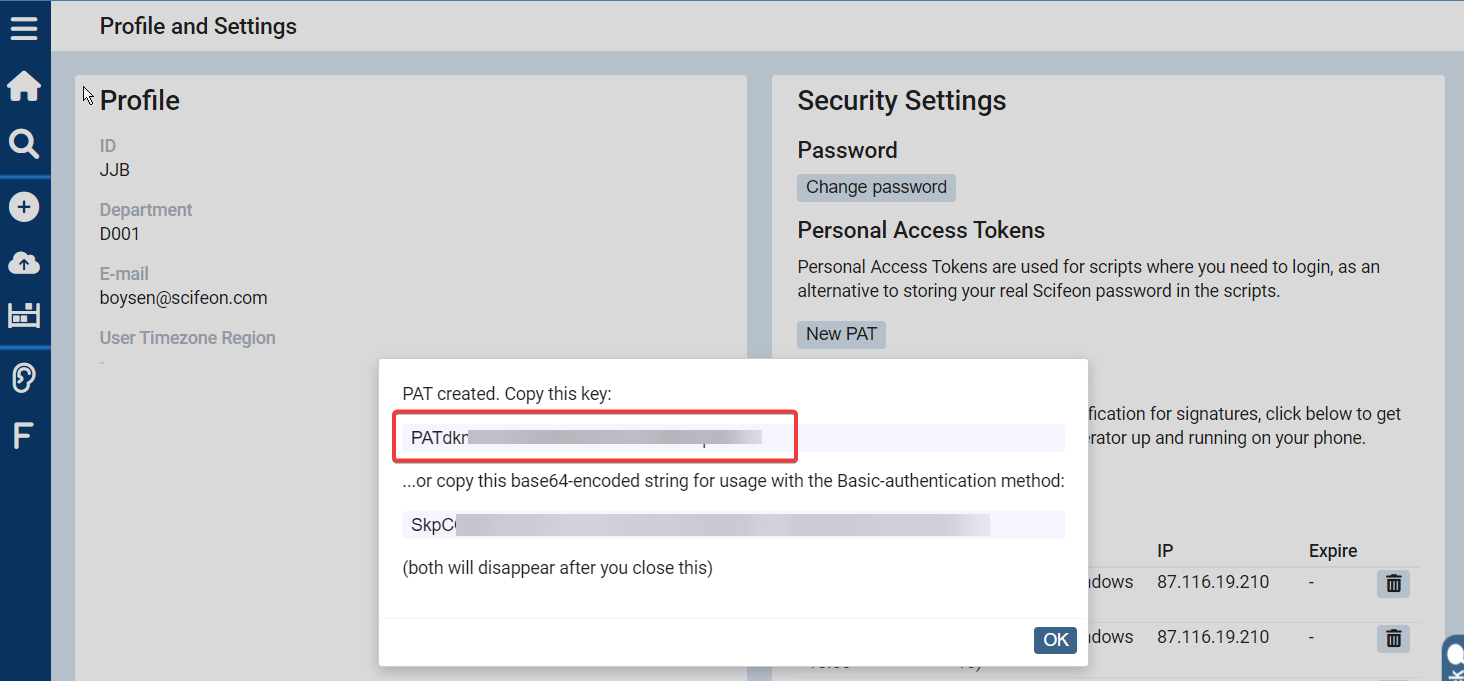- Open your user profile: go to https://{your-company}.scifeon.cloud/#/user/profile